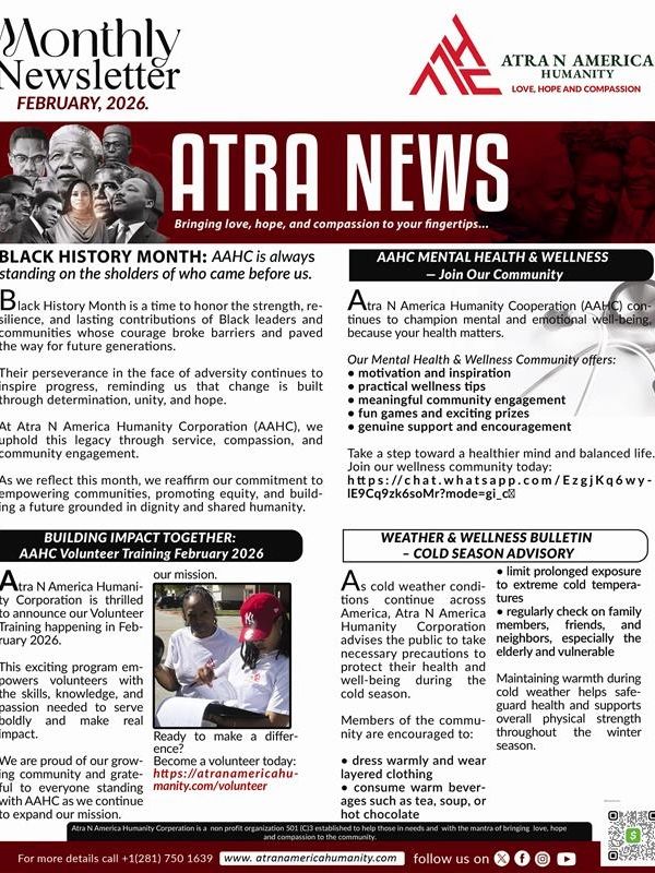 Page 1 of the January 2026 ATRA NEWS newsletter highlights Atra N America Humanity’s continued commitment to love, hope, and compassion. This edition features our Adopt-A-Family Holiday Initiative, where families in Africa and the U.S. received essential support during the holiday season. It also spotlights volunteer engagement and community impact, showcasing how teamwork and service are strengthening our programs.